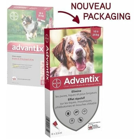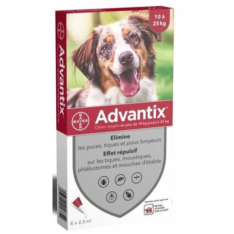 Spectre large de protection contre les puces, les tiques, les phlébotomes, les poux et les mouches – 6 pipettes – Diffusion rapide (en moins de 24h) – Utilisable chez les chiots des 7 semaines et sur la femelle gestante ou en lactation – Efficace sur le chien mouillé – Fermeture avec sécurité enfant – Pour chien de 10 a 25kg.
