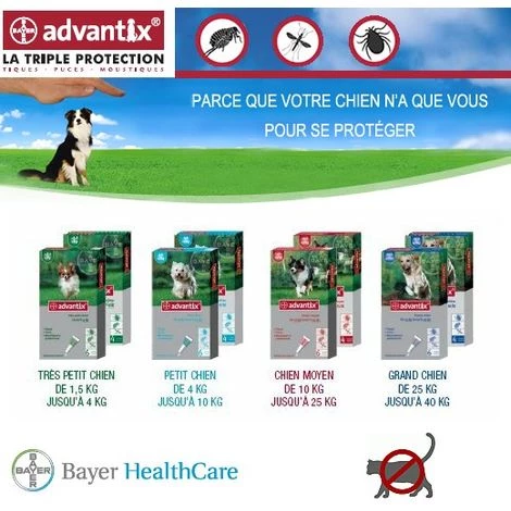 Advantix est un antiparasitaire externe, propose une triple protection contre les tiques, les puces, les moustiques et les phlébotomes.