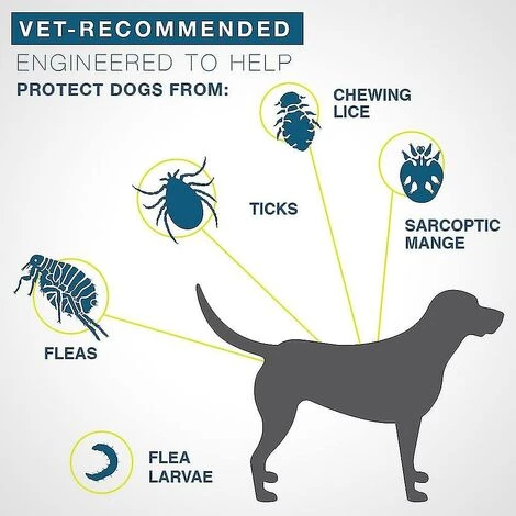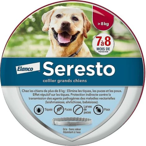 Collier antiparasitaire durable : Seresto protège votre chien des puces pendant 7 à 8 mois et des tiques jusqu’à 8 mois. Effet : Seresto agit sur les parasites avant même qu’ils ne mordent/mordent vos animaux, en évitant la douleur, l’inconfort et le stress. Technologie unique : Seresto Le collier libère progressivement les principes actifs tout au long du traitement. Protégez uniformément la tête et la queue de votre chien des odeurs, de la texture grasse ou du toucher et imperméable : les caractéristiques du collier sont conçues pour ne pas interférer avec la relation de votre animal avec vous. Le collier antiparasitaire Seresto est toujours efficace pour réduire le risque de leishmaniose en cas de contact modéré avec l’eau : cette maladie transmise par les phlébotomes est incurable et peut être grave voire mortelle pour votre chien. Contenu : 0,13 kg d’ingrédients efficaces : imidaclopride et fluthrine