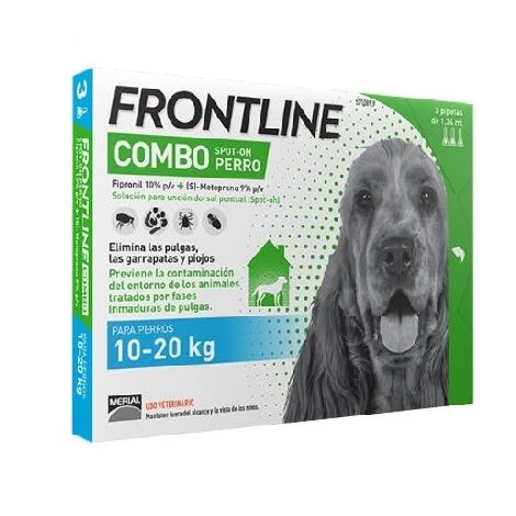 FrontLineÂÂ Fleas & Ticks. Chiens Combo FrontLineÂÂ. Prot_gez votre animal de compagnie et votre espace que vous partagez. Antiparasite externe dans la pipette qui offre š votre animal de compagnie une excellente protection contre les puces, ses “ufs et des larves, des poux et des tiques. Sa formule avec iGR se termine par des puces š son stade pr_c_dent prot_geant les r_infestacones dans l’espace que vous partagez. Il contient du fipronil, de la substance d’insecticide avec une grande rapidit_ d’action et de la (s) -etoprne un r_gulateur de la croissance des insectes (IGR) qui _vite la contamination de l’environnement par des phases immatures des puces. Il peut tre utilis_ chez les chiots avec +8 semaines de vie ou un poids sup_rieur š 2 kg. Il peut tre utilis_ chez les femelles enceintes et la p_riode d’allaitement. Avant que le bain respecte une p_riode de 48 h aprs chaque application de la combinaison de frontline. Pour les chiens moyens 10 – 20 kg. Boîte 3 pipettes. V_rifiez auprs de votre v_t_rinaire si vous avez des doutes sur la faon de traiter votre animal de compagnie. Fabriqu_ en France.