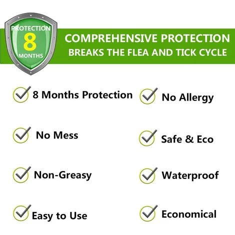 PROTECTION DE 8 MOIS: peut protéger vos chiens contre le contrôle des puces et des tiques 24h / 24 et 7j / 7 pour une période allant jusqu’à 8 mois. Les principes actifs fonctionneront mieux pendant cette période, ce qui permettra de repousser efficacement toutes sortes de tiques et de puces, offrant ainsi la prévention ultime contre les puces et les tiques pour les chiens. Après cela, il devrait être remplacé pour une autre protection maximale.