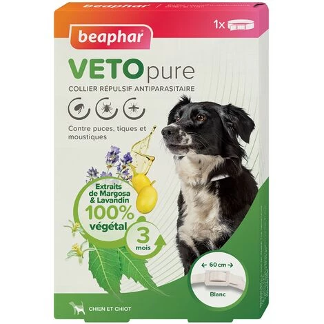 Ces colliers répulsifs antiparasitaires VETOPURE luttent contre la prolifération des parasites au niveau du pelage de l’animal. Assure une diffusion continue pour une protection garantie. Collier répulsif antiparasitaire pour chien BEAPHAR. Diffusion continue des extraits de Margosa et de Lavandin. Contre les puces, tiques et moustiques. Protection de 3 mois. Résiste à l’eau et l’humidité. Ne trouble pas les sens olfactifs du chien ou du chiot. Disponibles en différents coloris : blanc, beige et marron. Dimensions : 60cm. En cas d’infestations parasitaires massives, il est conseillé de traiter l’environnement de l’animal et l’habitat avec un insecticide de la gamme Vetopure de Beaphar, comme le spray, le pulvérisateur et les diffuseurs automatiques insecticides habitation. Biocide TP19. « Dangereux. Respecter les précautions d’emploi ». Utilisez les biocides avec précaution. Avant toute utilisation, lisez l’étiquette et les informations concernant le produit.