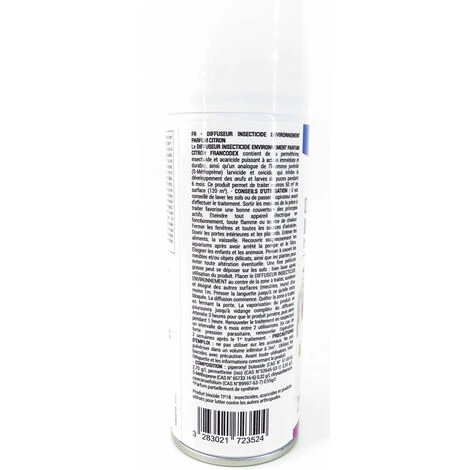- Le Diffuseur insecticide de l’environnement FRANCODEX contient de la perméthrine, insecticide et acaricide puissant à action immédiate et durable sur les insectes et