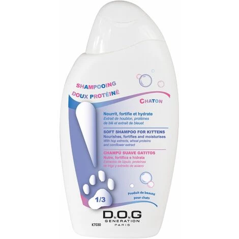 Si vous devez laver votre chaton alors nous vous conseillons ce shampoing Dog Génération spécialement formulé pour le poil et l’épiderme de votre petit animal.A base de houblon et de bleuet, il redonnera éclat et douceur au pelage de votre chaton. Shampoing doux Dog Génération pour chaton. Nourrit, fortifie et hydrate le poil de votre animal. Shampoing extra doux qui respecte l’épiderme de votre chaton. La gamme Dog Génération est formulée sans paraben. Le shampoing doux chaton est disponible en 250 ml. Dilution 1/3. « Dangereux. Respecter les précautions d’emploi ».