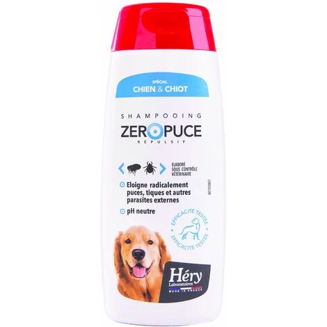 Le shampooing Zéro Puce Héry pour chien éloigne radicalement les puces, les tiques et autres parasites externes.Formulé sous contrôle vétérinaire, le pH est neutre.Conditionnement : 200 ml ou 5 L Shampoing zéro puce répulsif Héry pour chien ou chiot Eloigne les puces, les tiques, les phlébotomes, aoûtats et autres parasites externes Grâce à son pH neutre, il nettoie votre chien tout en douceur sans lui abimer le pelage Ne contient pas d’insecticide Formulé sous contrôle vétérinaire Produit exclusivement destiné aux chiens 2 conditionnements : 200 ml ou 5 L Insecticide TP18. Utilisez les biocides avec précaution. Avant toute utilisation, lisez l’étiquette et les informations concernant le produit. Avant toute utilisation, assurez vous que celle-ci est indispensable, notamment dans les lieux fréquentés par le grand public. Privilégiez chaque fois que possible les méthodes alternatives et les produits présentant le risque le plus faible pour la santé humaine et animale et pour l’environnement Dangereux. Respecter les précautions d’emploi. Lésions oculaires graves, Catégorie 1 (Eye Dam. 1, H318). Peut produire une réaction allergique (EUH208).