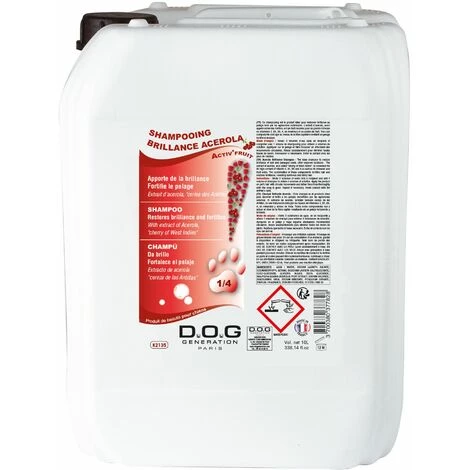 Le shampoing Réparateur Mangue lisse et hydrate les poils rêches ou abîmés.La gamme de shampoing Activ Fruit aux extraits naturel de fruit est élaborée sans PARABENDisponible en 3 conditionnements : 250 ml , 1 L ou 5 L Shampoing Brillance Acerola Dog Generation pour chien Apporte brillance et éclat redonner brillance au pelage terni par les agressions extérieures. L’extrait d’acerola , aussi appelé cerise des Antilles, est un fruit reconnu pour sa grande richesse en vitamines C, B1, B6, A, en minéraux et en acides de fruit. Tous ces composants vont agir au niveau de la fibre capillaire révélant un pelage fortifié et éclatant La gamme Activ’Fruit Dog Génération est sans PARABEN Aux extraits naturels de fruits Formulé dans le respect de la peau de l’animal et de son maître Disponible en flacon 250ml, 1 litre et bidon de 5 litres . « Dangereux. Respecter les précautions d’emploi ». Corrosif/irritant pour la peau, Catégorie 2 H315. Lésions oculaires graves/irritation oculaire, Catégorie 1 H318.