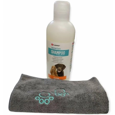 - Mouiller le pelage de votre chien avec de l’eau tiède, appliquez le shampoing uniformément et massez.