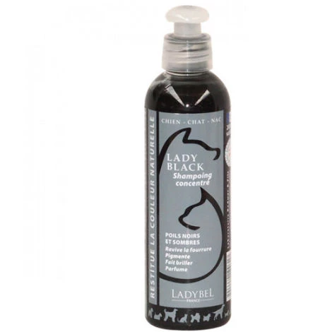 Le shampooing Ladybel colorant Noir aux protéines pour chien et chat est formulé pour améliorer qualité et couleur des pelages sombres et foncés des chiens d’exposition de beauté.