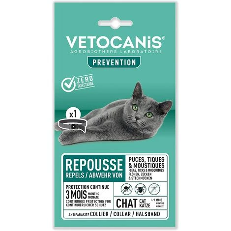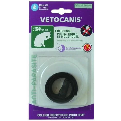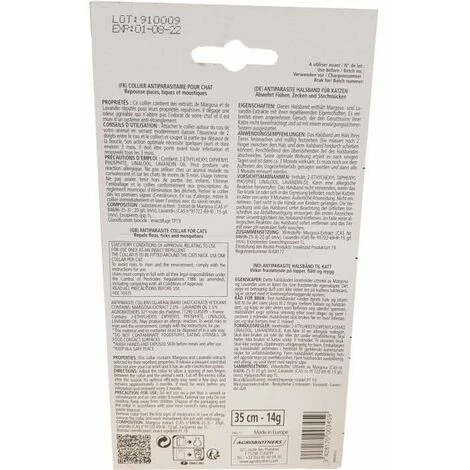 Collier insectifuge – Muni d’un systeme anti-étranglement – Contient des extraits de Margosa et de Lavandin – Permet de repousser les puces, les tiques et les moustiques – Dégage une odeur agréable qui n’altere pas l’odorat de votre chat – Longueur du collier : 35cm – Pour chat de plus de 9 mois.