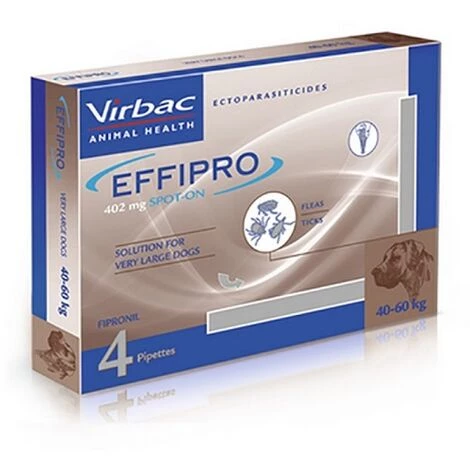 Les pipettes effignotiques de plus de 40 kg de chiens protgent vos chiens de paramails, comme ils sont conseill_s š contr»ler et š pr_venir des infestations de puces et de tiques. L’application mensuelle parvient š prot_ger votre mascotte des insectes efficaces tout au long de l’ann_e. Il est trs confortable et simple š utiliser, grŠce š votre systme Spot-ON. Ce produit est efficace contre les tiques et les puces. Les pipettes Effipro contiennent du fiphoniol, qui est un insecticide et un acaricide efficaces qu’il active contre le systme nerveux des parasites, provoquant la mort. Des d_mangeaisons, des blessures, des allergies, des infections, des maladies | Les puces et les tiques peuvent causer de graves problmes de sant_ pour animaux que vous pouvez maintenant empcher facilement avec un traitement appropri_. Pour _viter les problmes de sant_, nous devons pr_venir nos chiens en prot_geant les parasites tout au long de l’ann_e. Pr_sentation: boîte avec 24 pipettes Spot-sur 402 mg